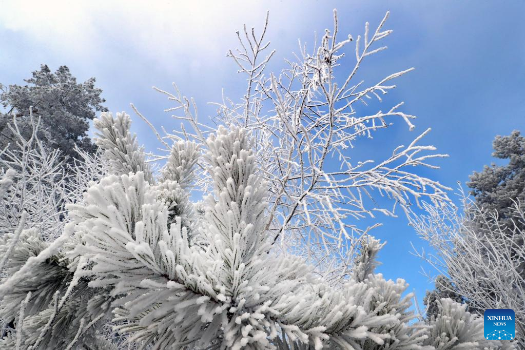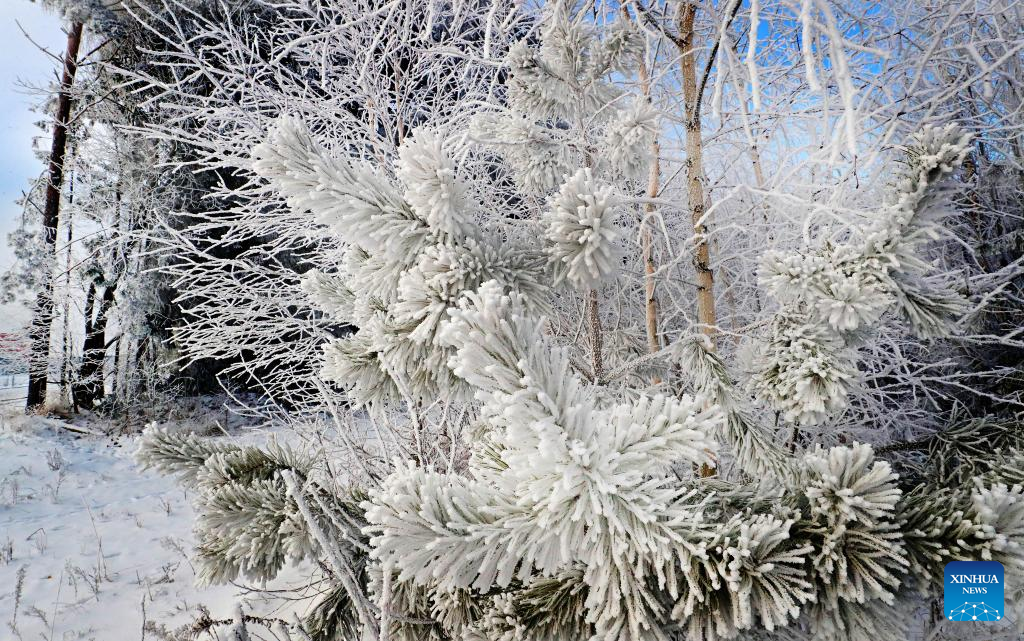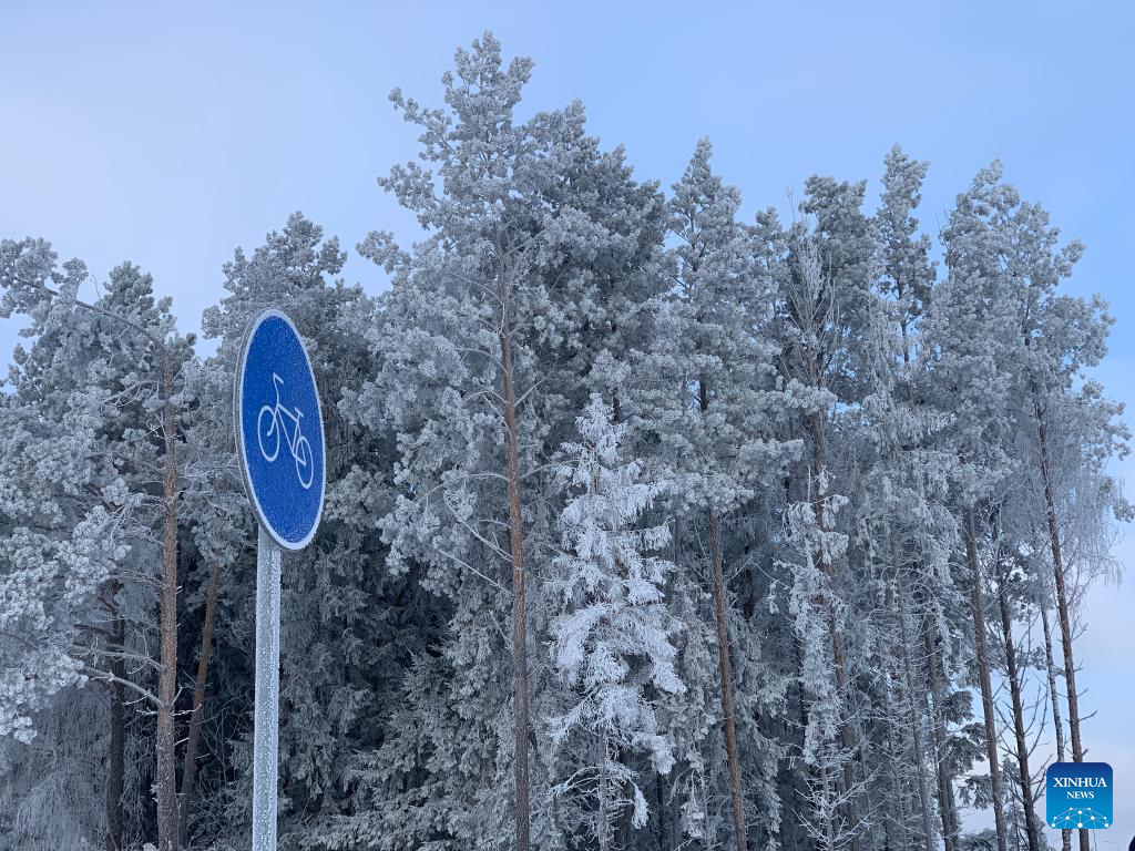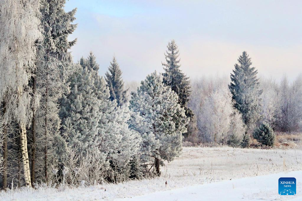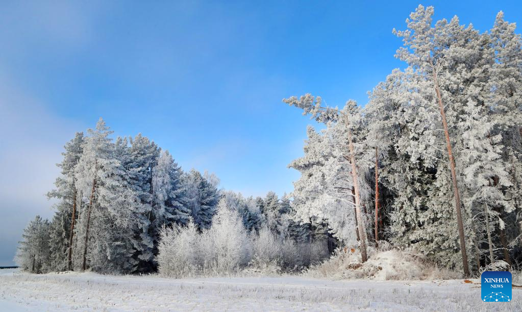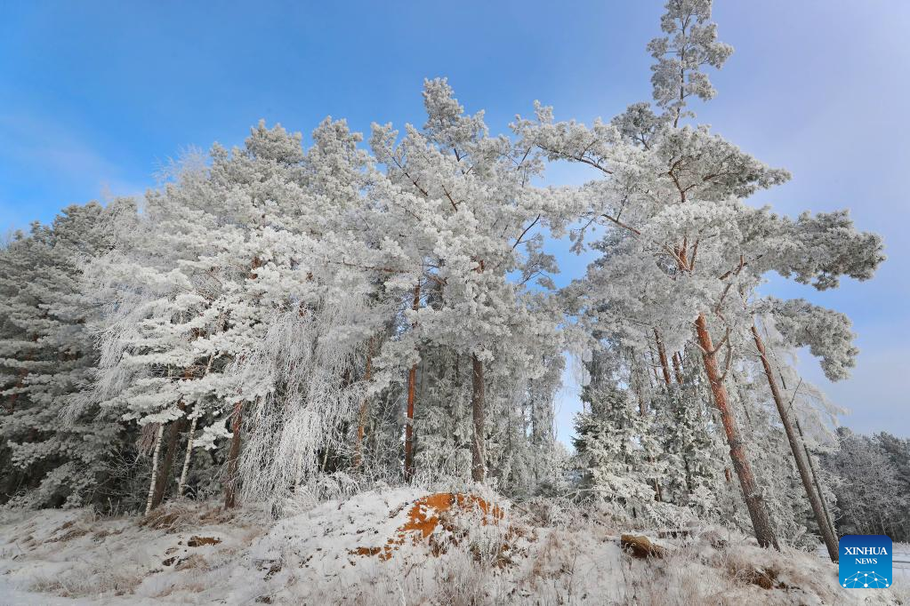 Photo shows rime-covered trees in Minsk, Belarus, Dec. 28, 2021. (Photo by Henadz Zhinkov/Xinhua)