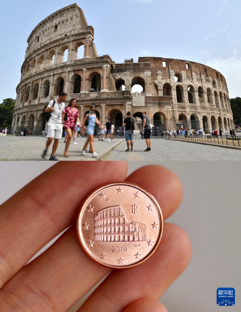 Combo photo shows the Colosseum in Rome, Italy, on Aug. 4, 2021 (up) and the Colosseo pattern on the back of the 5-cent coin in Rome, Italy, on Dec. 30, 2021. Euro banknotes and coins were physically introduced into eurozone countries in circulation on Jan. 1, 2002.