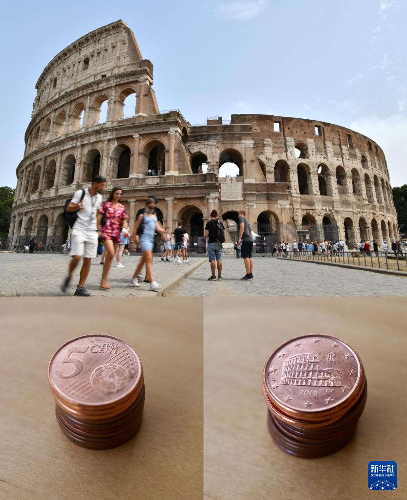 Combo photo shows the Colosseum in Rome, Italy on Aug. 4, 2021 (up), the front side of 5-cent coin in Rome, Italy on Dec. 30, 2021 (L, down) and the Colosseo pattern on the back of the 5-cent coin in Rome, Italy on Dec. 30, 2021. Euro banknotes and coins were physically introduced into eurozone countries in circulation on Jan. 1, 2002.
