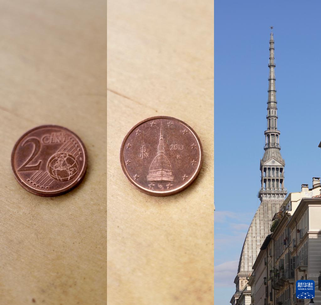 Combo photo shows the front side of 2-cent coin in Rome, Italy, on Dec. 30, 2021, the Mole Antonelliana pattern on the back of the 2-cent coin in Rome, Italy, on Dec. 30, 2021 and the Mole Antonelliana in Turin, Italy, on Nov. 8, 2021 (from L to R). Euro banknotes and coins were physically introduced into eurozone countries in circulation on Jan. 1, 2002.