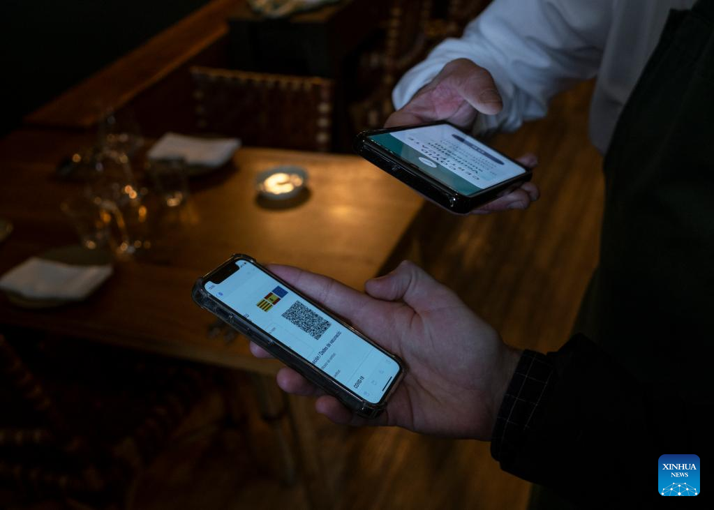 Citizens verify the COVID-19 passport required to enter a bar in Barcelona, Spain, Dec. 28, 2021. (Photo by Joan Gosa/Xinhua)