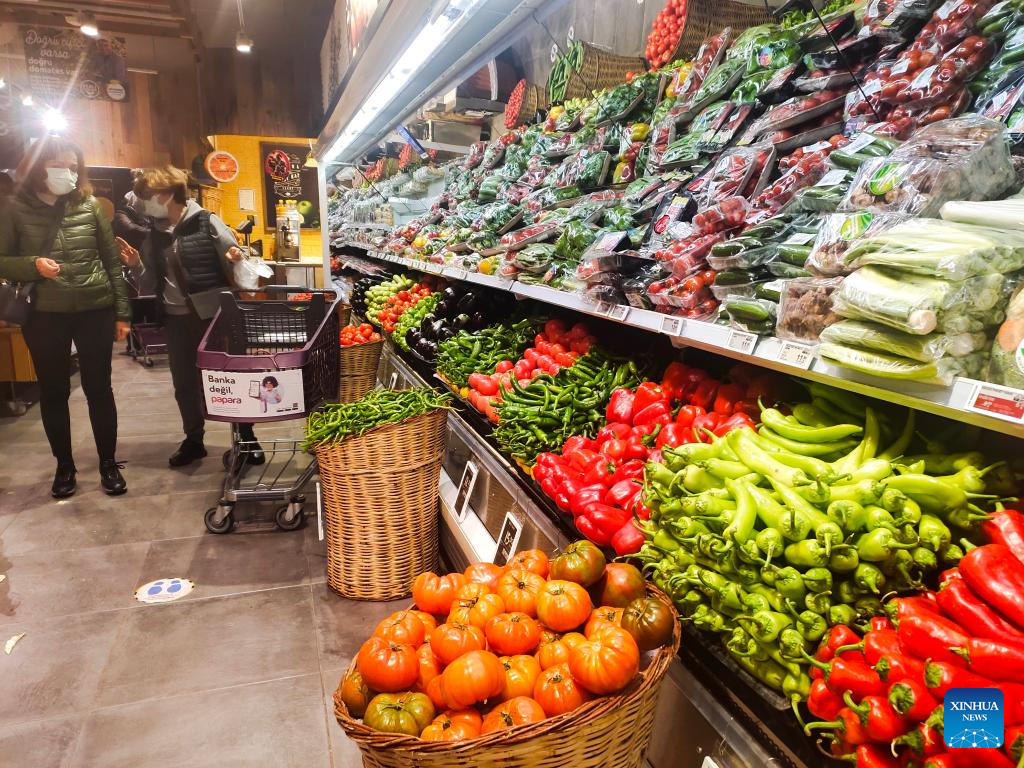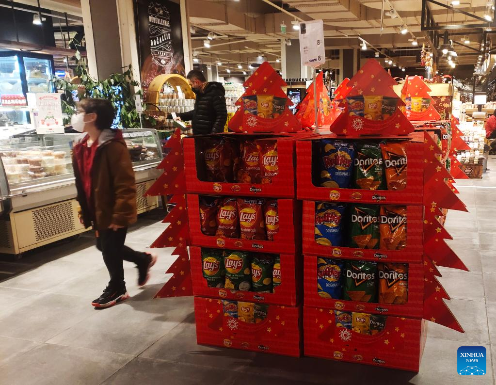 People do shopping at a supermarket in Istanbul, Turkey, on Dec. 30, 2021. Turkey's shopkeepers have gradually started to lower the prices of several goods as the Turkish currency lira rebounded, but the decrease appeared to be below expectations for now. (Xinhua/Shadati)