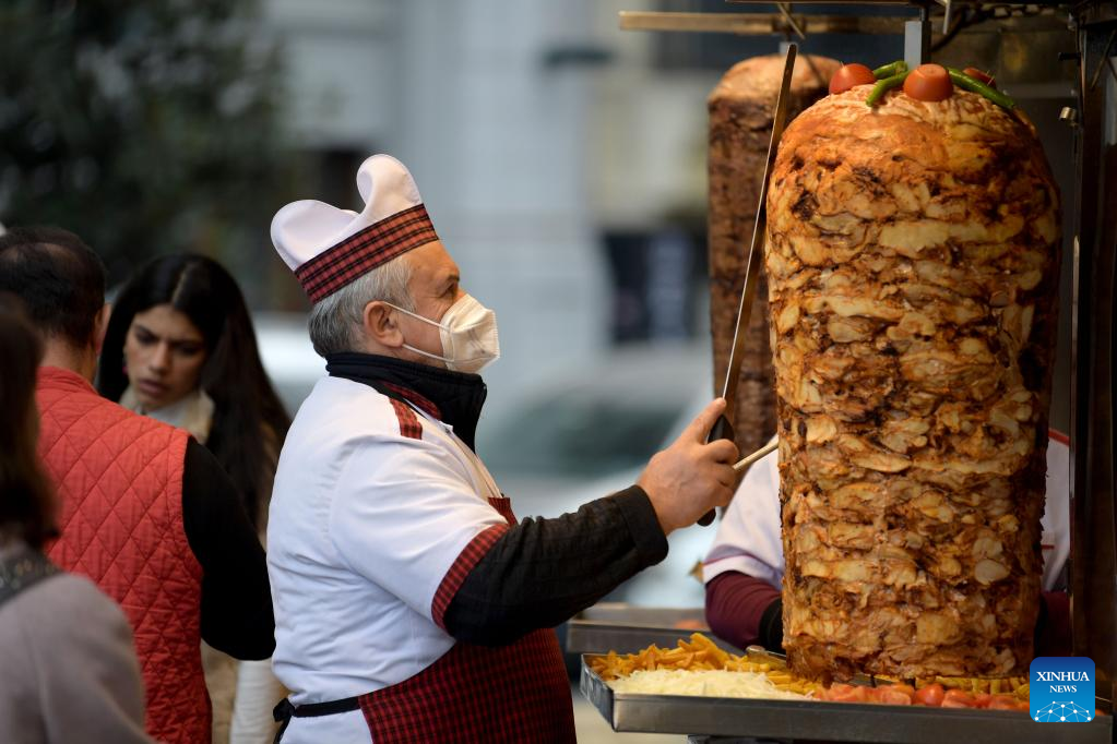A chef works at a food booth in Istanbul, Turkey, on Dec. 29, 2021. Turkey's shopkeepers have gradually started to lower the prices of several goods as the Turkish currency lira rebounded, but the decrease appeared to be below expectations for now. (Xinhua/Shadati)