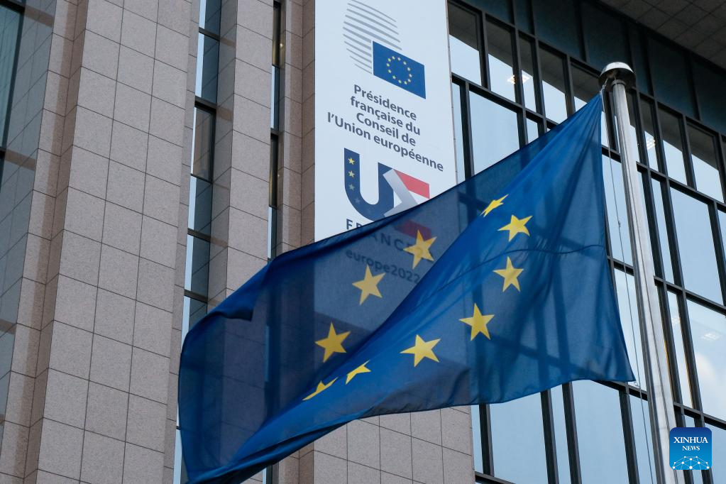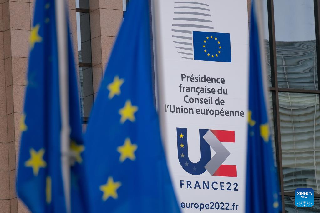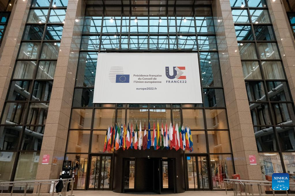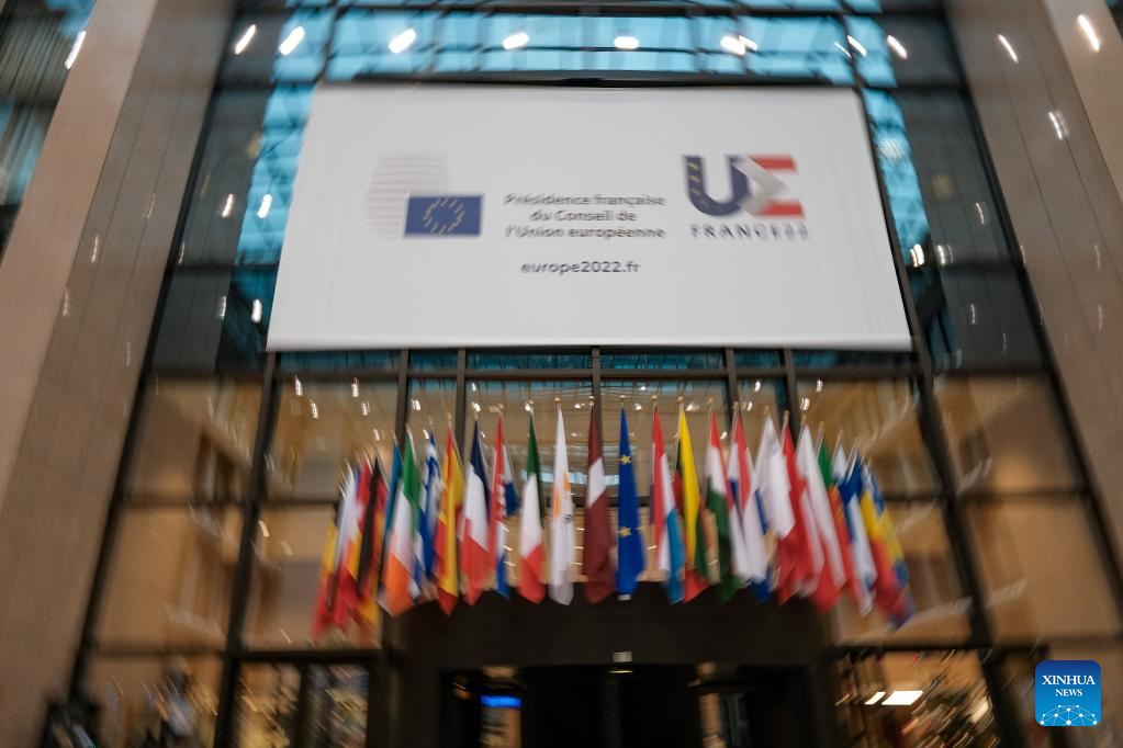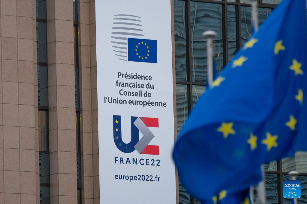 Photo taken on Jan. 4, 2022 shows a decoration at the headquarters of the Council of the European Union (EU) marking France's hold of the half-year rotating presidency of the EU Council, in Brussels, Belgium. France took over the presidency on Jan. 1, 2022. (Xinhua/Zhang Cheng)