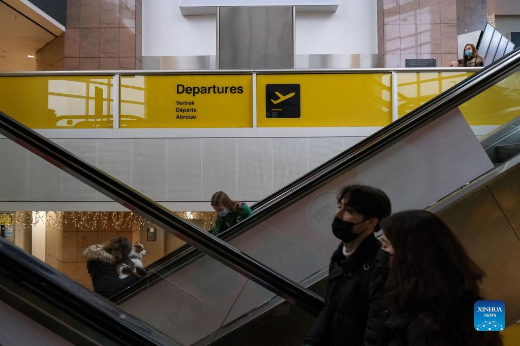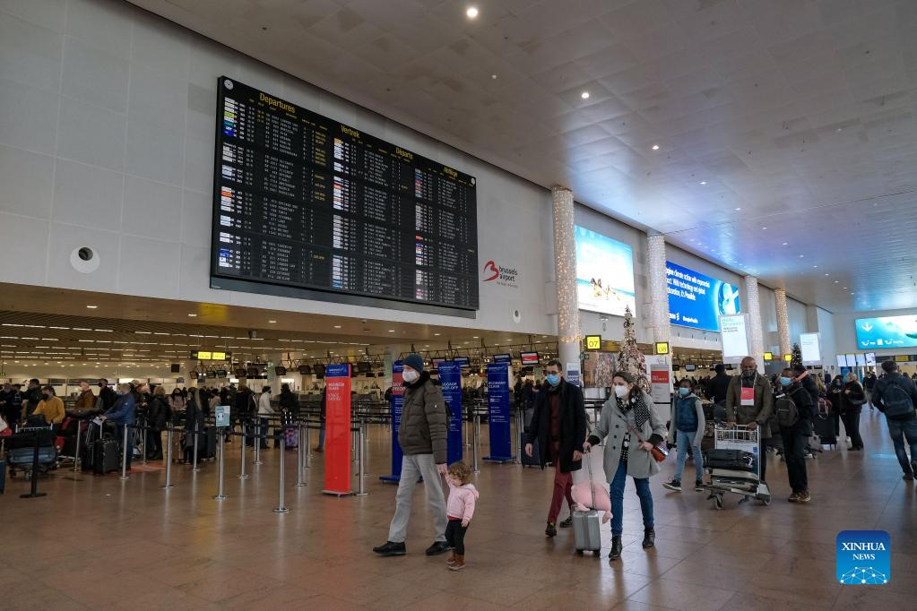 People are seen at Brussels Airport in Zaventem, Belgium, on Jan. 8, 2022. Belgium witnessed an increase in COVID-19 cases recently, with a daily average of 15,996 during the period from Dec. 29, 2021 to Jan. 4, 2022, according to the Belgian health institute Sciensano. (Xinhua/Zhang Cheng)