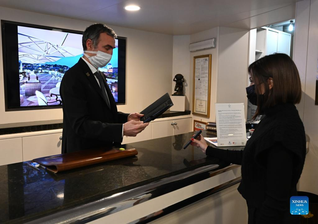 A staff member checks the "super green pass" of a woman at a hotel in Rome, Italy, on Jan. 10, 2022. Starting from Monday, only those with a "super green pass," which proves the holder is vaccinated or has recovered from COVID-19, maintain the right to access public venues and public transport in Italy. (Photo by Alberto Lingria/Xinhua)