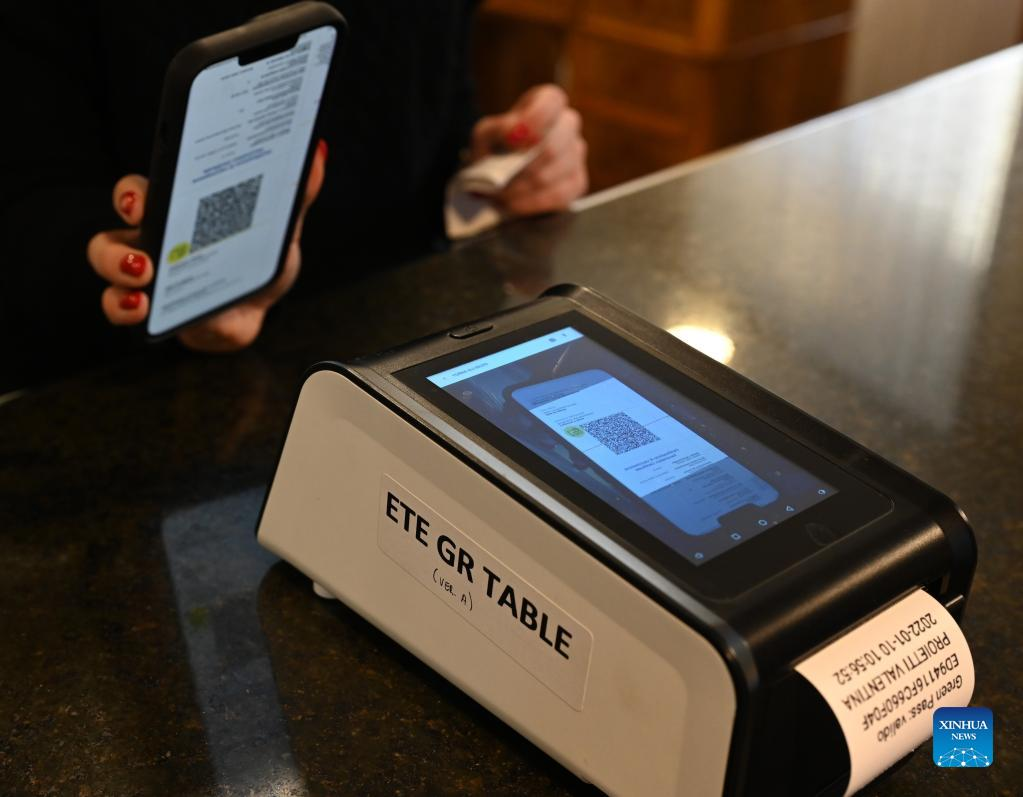 A "super green pass" scanner machine is seen at a hotel in Rome, Italy, on Jan. 10, 2022. Starting from Monday, only those with a "super green pass," which proves the holder is vaccinated or has recovered from COVID-19, maintain the right to access public venues and public transport in Italy. (Photo by Alberto Lingria/Xinhua)