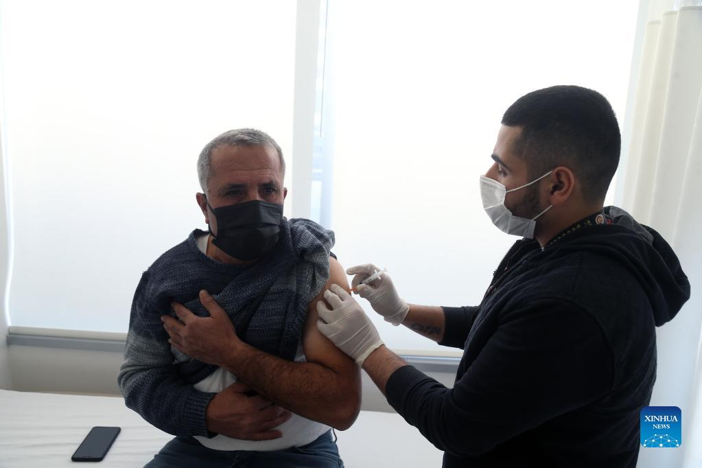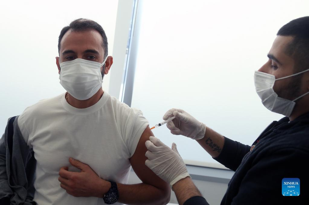 A man receives a dose of COVID-19 vaccine in Ankara, Turkey, on Jan. 12, 2022. Turkey on Wednesday reported 77,722 new COVID-19 cases, the highest daily figure on record, raising its tally of infections to 10,195,676, according to its health ministry. (Photo by Mustafa Kaya/Xinhua)