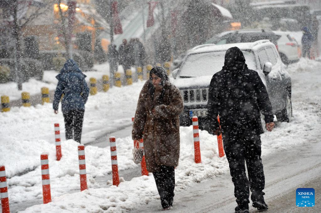 People walk in snowy weather in Ankara, Turkey, on Jan. 22, 2021. (Photo by Mustafa Kaya/Xinhua)