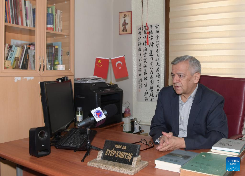 Eyup Saritas, head of the Chinese Language and Literature Department at Istanbul University, is interviewed with Xinhua in Istanbul, Turkey, Jan. 28, 2022. (Xinhua/Shadati)