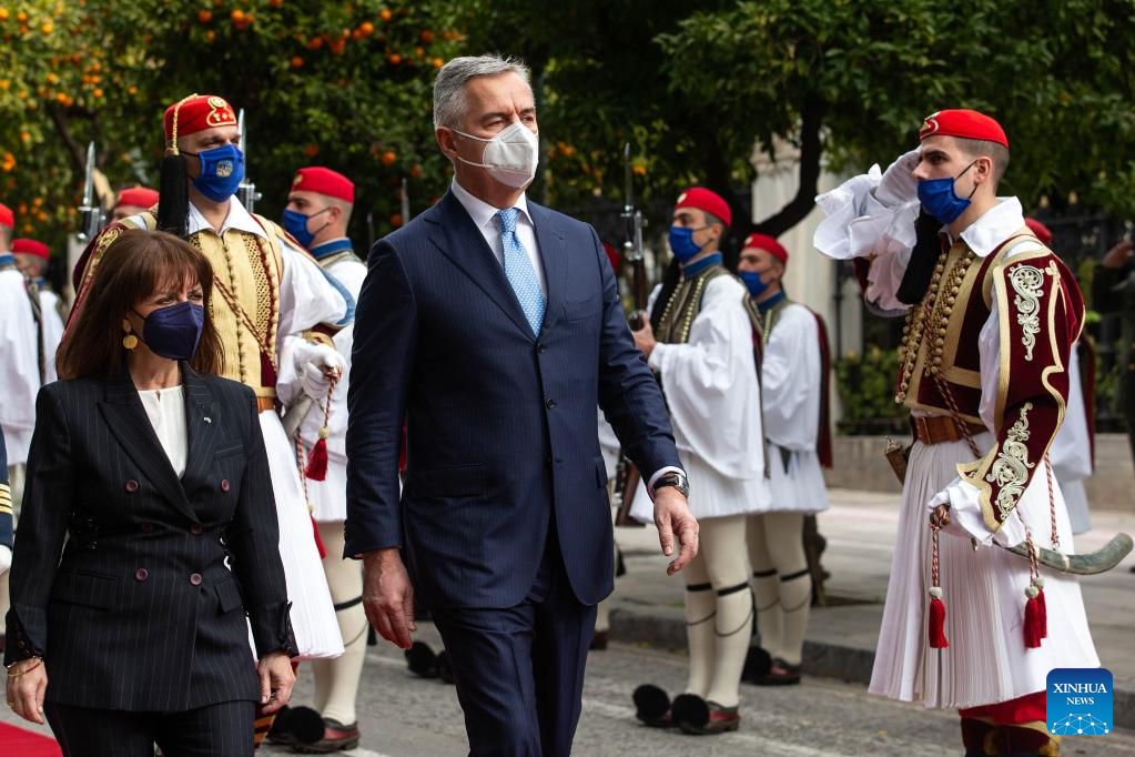 Greek President Katerina Sakellaropoulou (1st L, Front) welcomes Montenegrin President Milo Djukanovic (2nd L, Front) in Athens, Greece, on Feb. 8, 2022. Montenegro expects Greece's continued support for its accession to the European Union (EU), visiting Montenegrin President Milo Djukanovic said here on Tuesday. (Xinhua/Marios Lolos)