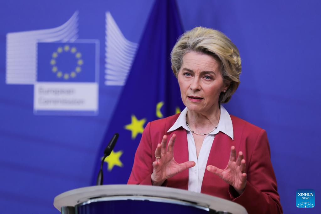 European Commission President Ursula von der Leyen speaks about the Commission's "European Chips Act" at the European Union (EU) headquarters in Brussels, Belgium, Feb. 8, 2022. The EU has outlined a 15 billion-euros plan to boost its semiconductor industry for a desired green and digital transition, and a leading position in chips manufacturing. (Xinhua/Zheng Huansong)