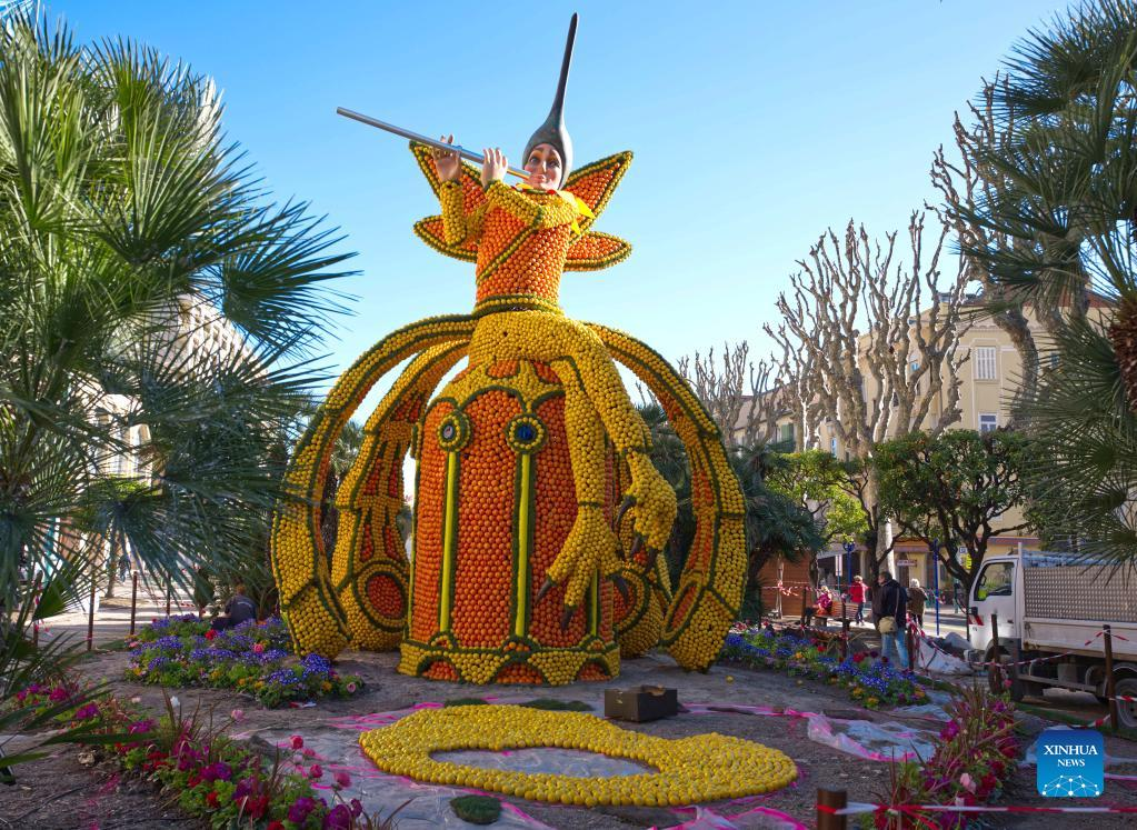 Workers decorate an installation during preparations for the annual Lemon Festival in Menton, France, on Feb. 9, 2022. The 2022 Menton Lemon Festival will be held from Feb. 12 to Feb. 27. (Photo by Serge Haouzi/Xinhua)