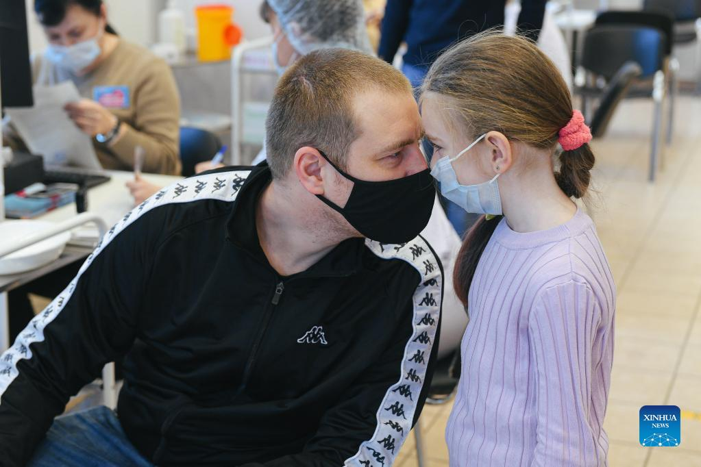 A man plays with his daughter before taking the vaccine Sputnik V against COVID-19 in the vaccination center in GUM department store in Moscow, Russia, Feb. 11, 2022. Russia registered 203,949 new COVID-19 cases in the past 24 hours, the highest single-day increase to date, taking the national tally to 13,731,794, the official monitoring and response center said Friday. (Xinhua/Bai Xueqi)