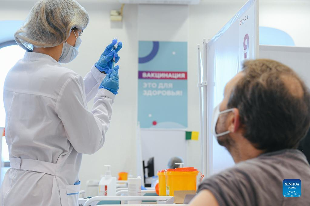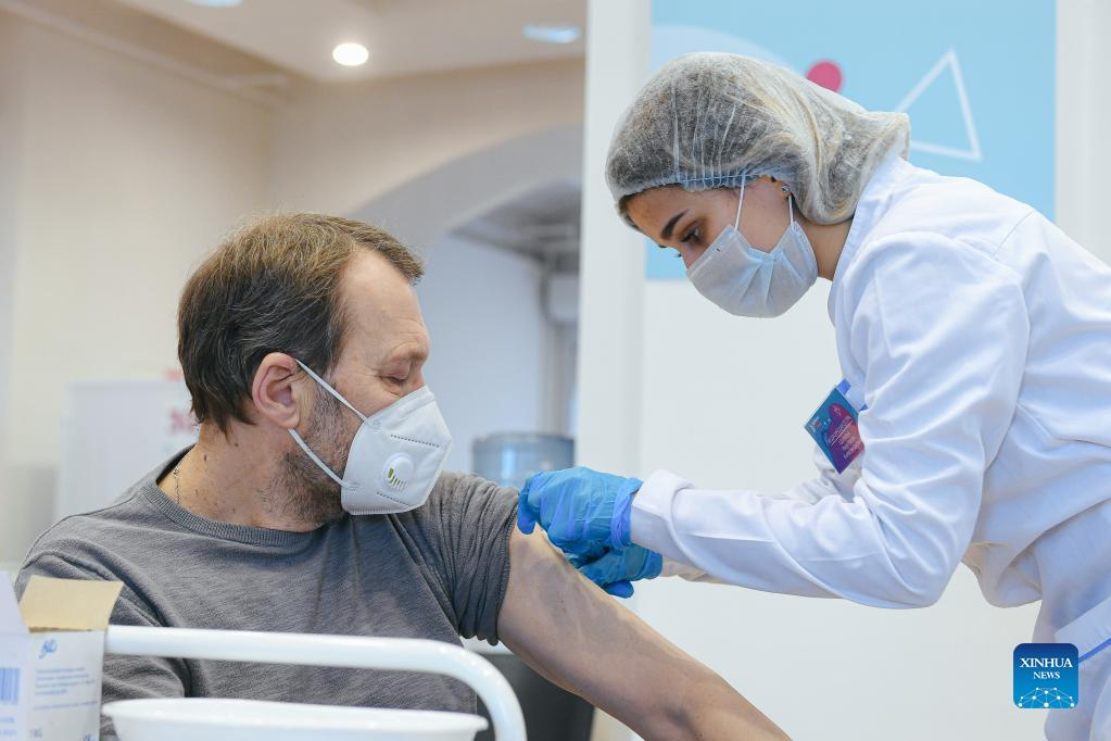 A man gets vaccinated against COVID-19 in the vaccination center at GUM department store in Moscow, Russia, Feb. 11, 2022. Russia registered 203,949 new COVID-19 cases in the past 24 hours, the highest single-day increase to date, taking the national tally to 13,731,794, the official monitoring and response center said Friday. (Xinhua/Evgeny Sinitsyn)