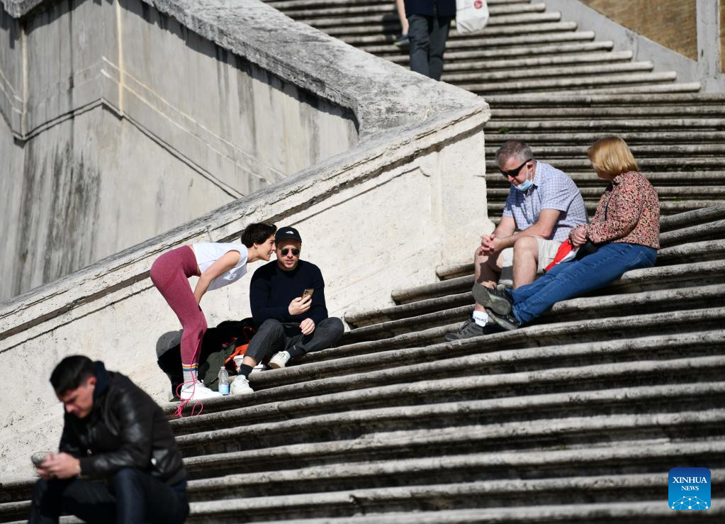 People enjoy leisure time at Spanish Steps in Rome, Italy, on Feb. 11, 2022. (Xinhua/Jin Mamengni)