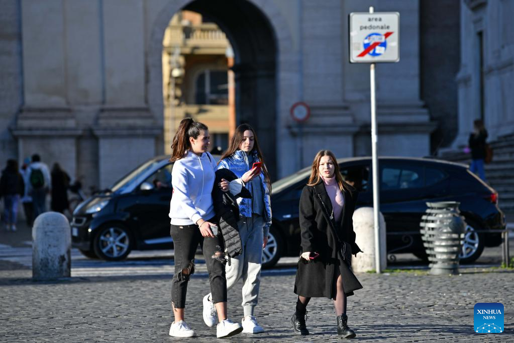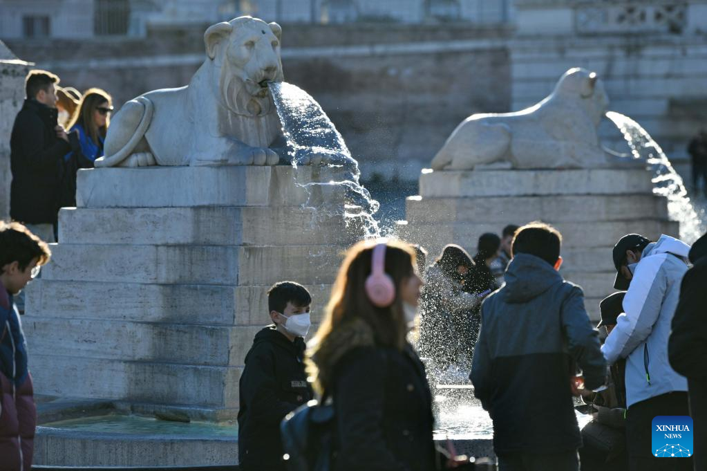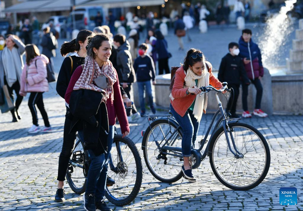 People are seen at Piazza del Popolo in Rome, Italy, on Feb. 11, 2022. (Xinhua/Jin Mamengni)