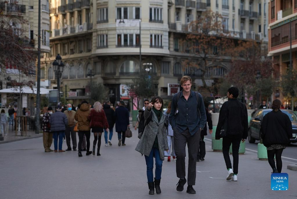People walk in downtown Valencia, Spain, on Feb. 11, 2022. Spain lifted the obligation to wear face masks outdoors on Feb. 10. (Photo by Pablo Morano/Xinhua)