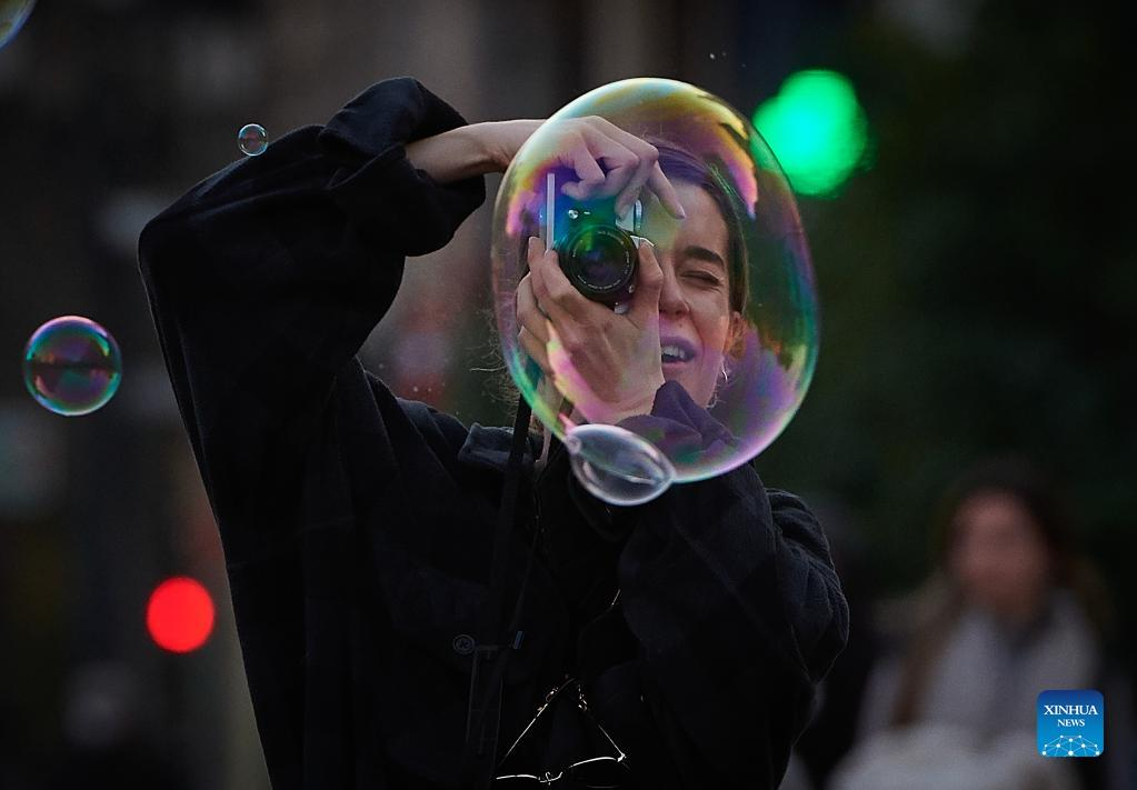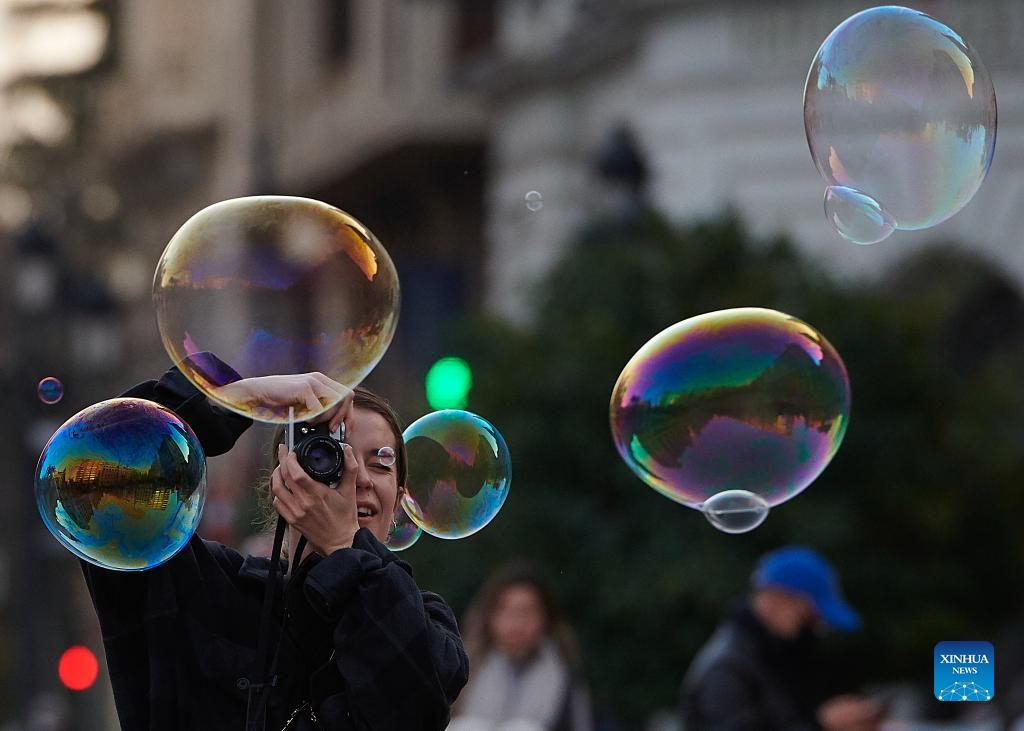 A woman takes pictures in downtown Valencia, Spain, on Feb. 11, 2022. Spain lifted the obligation to wear face masks outdoors on Feb. 10. (Photo by Pablo Morano/Xinhua)