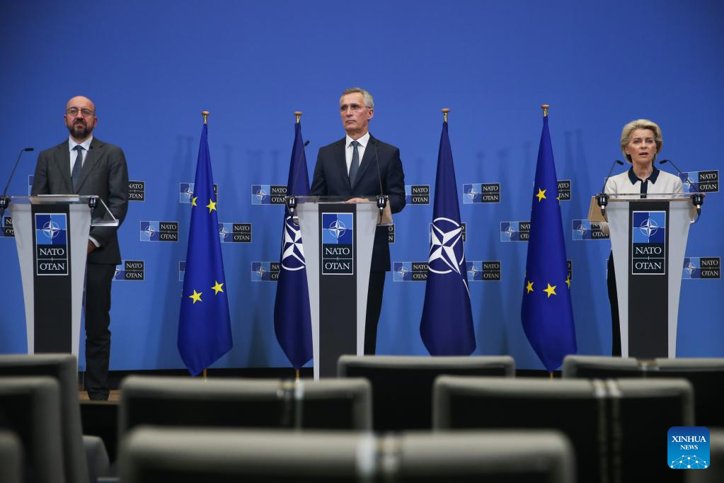 Secretary-General of the North Atlantic Treaty Organization (NATO) Jens Stoltenberg (C), European Commission President Ursula von der Leyen (R) and European Council President Charles Michel attend a press conference at NATO headquarters in Brussels, Belgium, Feb. 24, 2022. (Xinhua/Zheng Huansong)