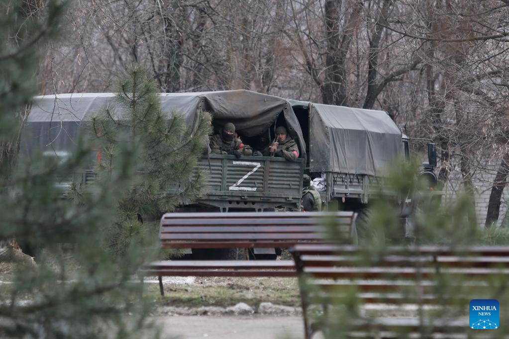 Photo taken on March 1, 2022 shows armed personnel in Donetsk. (Photo by Victor/Xinhua)