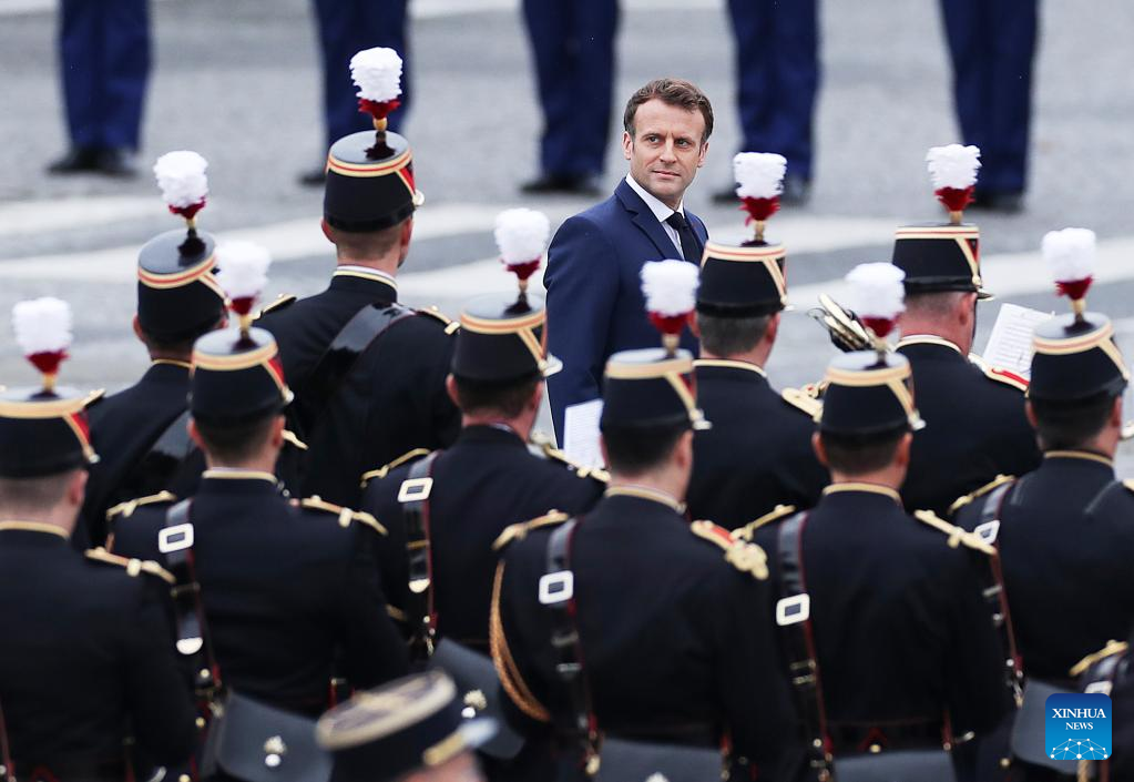 File photo taken on July 14, 2021 shows French President Emmanuel Macron attending the annual Bastille Day military parade in Paris, France. French President Emmanuel Macron officially announced on Thursday that he would run for a second term in office in the upcoming presidential elections scheduled for April. (Xinhua/Gao Jing)