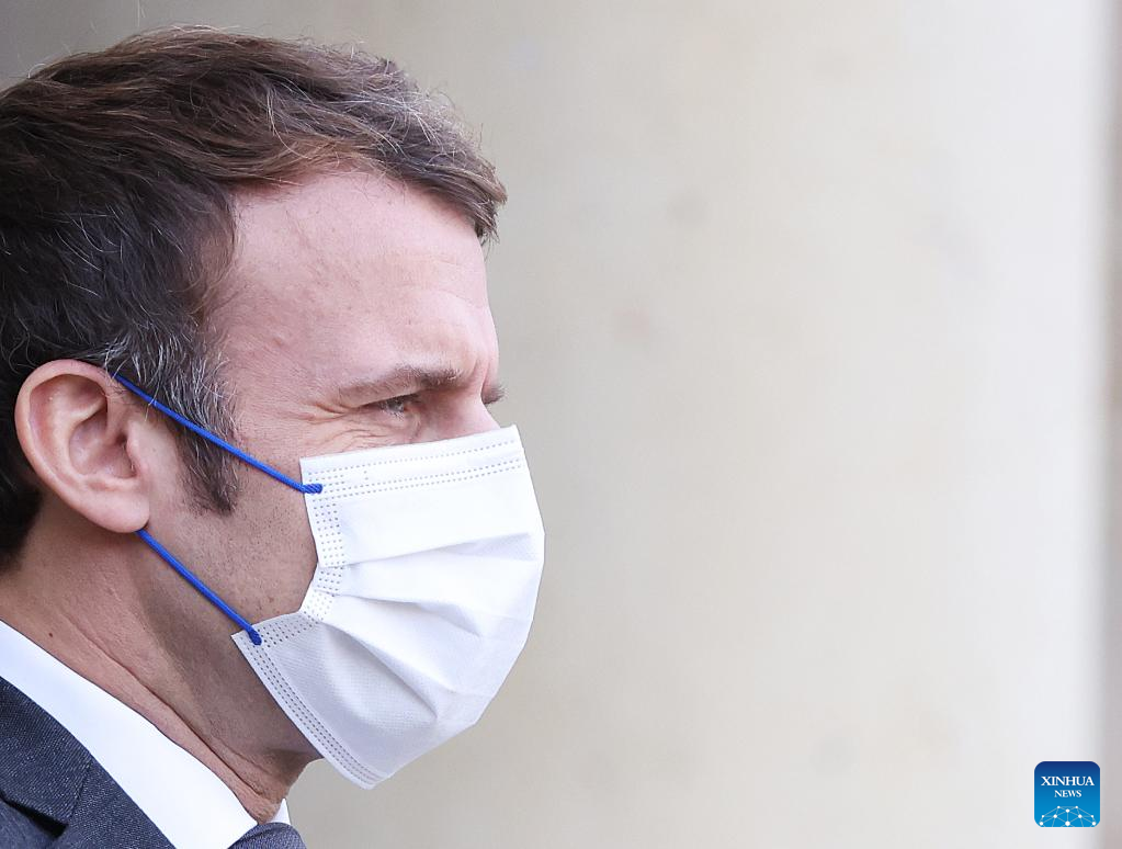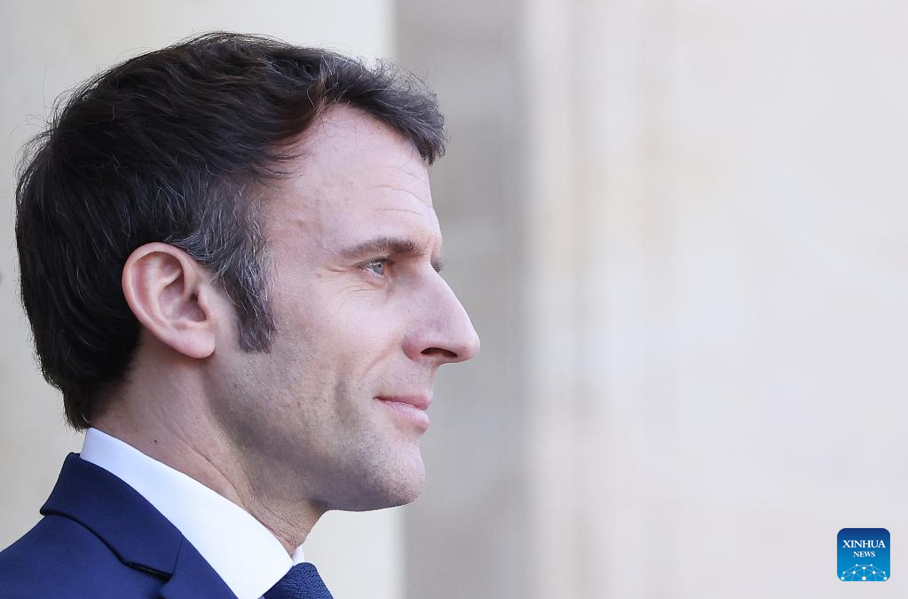 File photo taken on Feb. 28, 2022 shows French President Emmanuel Macron waiting for guests at the Elysee Palace in Paris, France. French President Emmanuel Macron officially announced on Thursday that he would run for a second term in office in the upcoming presidential elections scheduled for April. (Xinhua/Gao Jing)