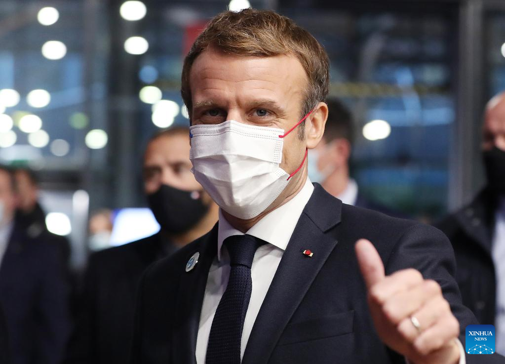 File photo taken on Nov. 11, 2021 shows French President Emmanuel Macron arriving to attend the opening ceremony of the 4th Paris Peace Forum at la Grande Halle de la Villette in Paris, France. French President Emmanuel Macron officially announced on Thursday that he would run for a second term in office in the upcoming presidential elections scheduled for April. (Xinhua/Gao Jing)
