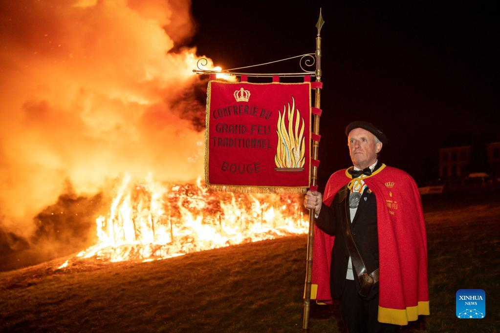 Local residents wearing traditional costumes attend the "Great Fire" ceremony in Bouge of Namur, Belgium, March 6, 2022. On the first Sunday of Lent, people in Bouge celebrated spring's coming with a ceremony of lighting a colossal bonfire, during which the "Winter Man" is burnt. This tradition has been perpetuated for over 1,000 years. (Xinhua/Zhang Cheng)