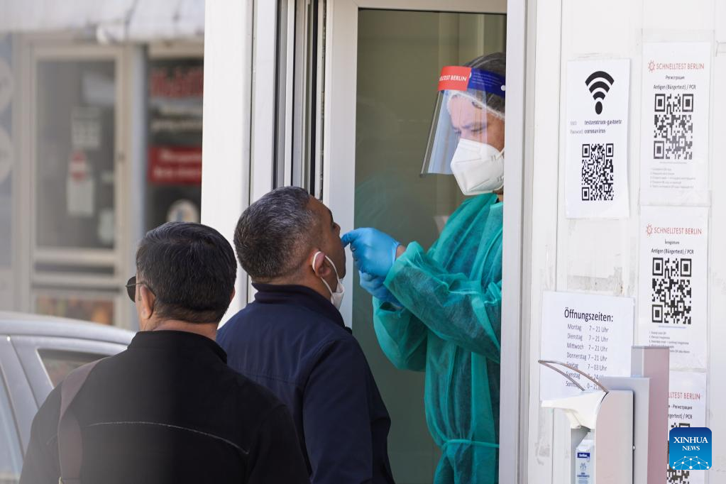 A man has a COVID-19 test at a test station in Berlin, capital of Germany, on March 24, 2022. (Photo by Stefan Zeitz/Xinhua)
