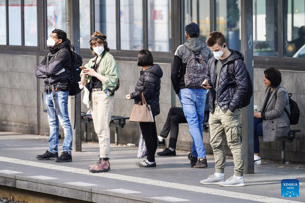 Passengers wearing face masks are seen on a platform of a station in Berlin, capital of Germany, on March 24, 2022. (Photo by Stefan Zeitz/Xinhua)