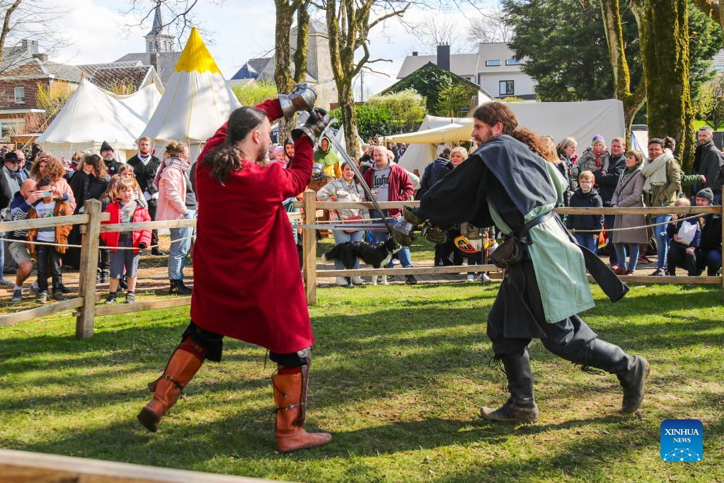 Visitors watch a fight performance during the 20th medieval festival of Ouffet in Ouffet, province of Liege, Belgium, on April 10, 2022. Highlighting performances, markets as well as various activities with the culture of the Middle Ages, the two-day festival attracted many visitors. (Xinhua/Zheng Huansong)