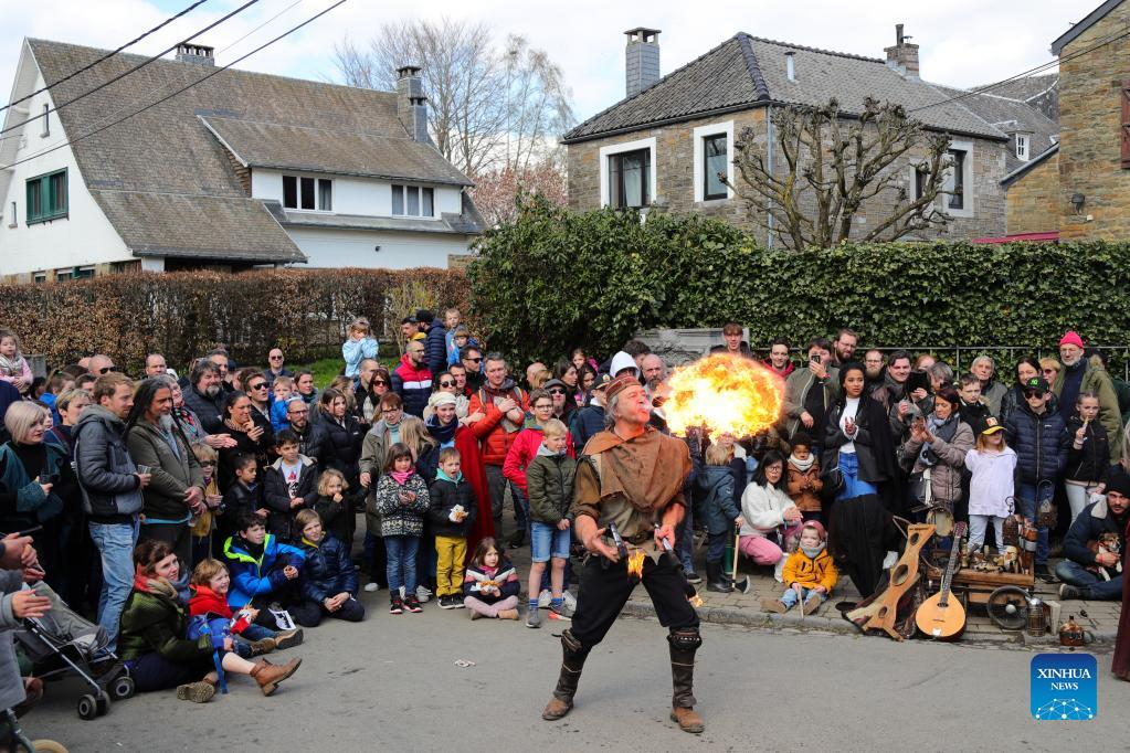 A fire breather performs during the 20th medieval festival of Ouffet in Ouffet, province of Liege, Belgium, on April 10, 2022. Highlighting performances, markets as well as various activities with the culture of the Middle Ages, the two-day festival attracted many visitors. (Xinhua/Zheng Huansong)
