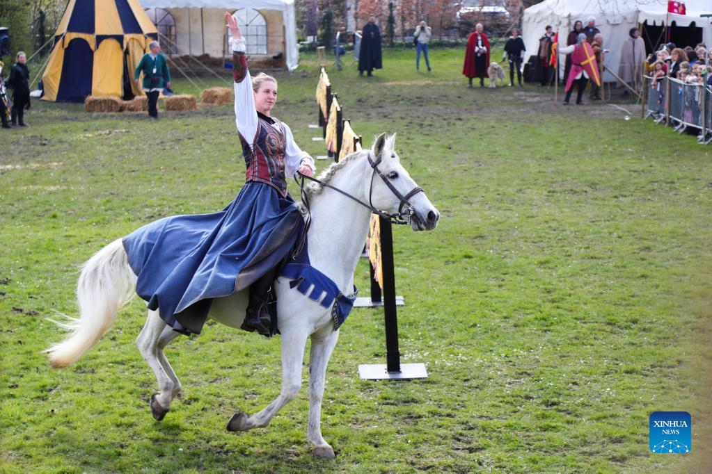 A rider in costumes performs during the 20th medieval festival of Ouffet in Ouffet, province of Liege, Belgium, on April 10, 2022. Highlighting performances, markets as well as various activities with the culture of the Middle Ages, the two-day festival attracted many visitors. (Xinhua/Zheng Huansong)