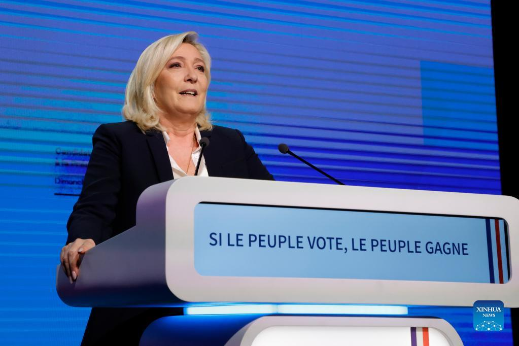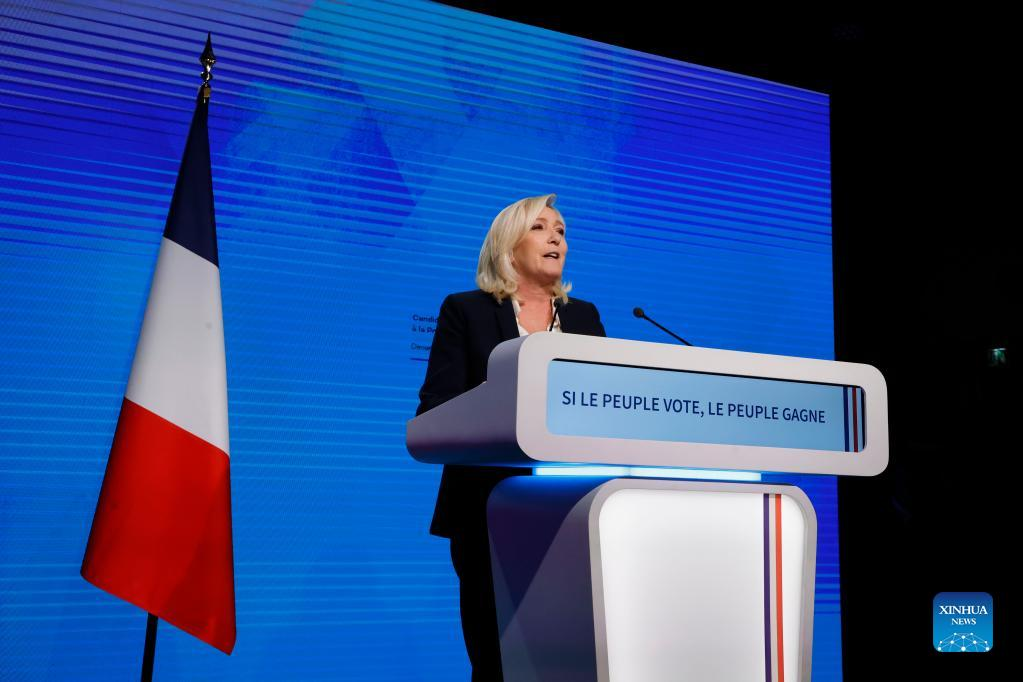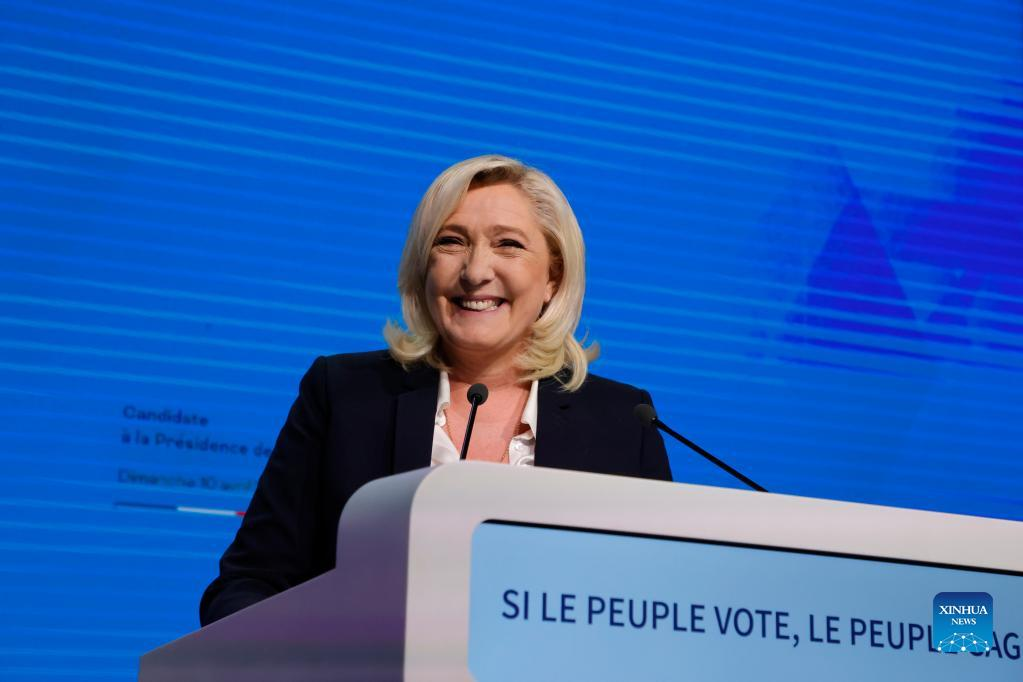 French far-right National Rally party candidate Marine Le Pen delivers a speech at a rally after the first round of French presidential election in Paris, France, on April 10, 2022. French incumbent President Emmanuel Macron and far-right wing candidate Marine Le Pen are the top two leaders of the first round of the 2022 French presidential election with respectively 28.6 percent and 23.7 percent of the votes, according to a preliminary exit poll carried out Sunday by Elabe and released by French television BFMTV. (Photo by Rit Heize/Xinhua)