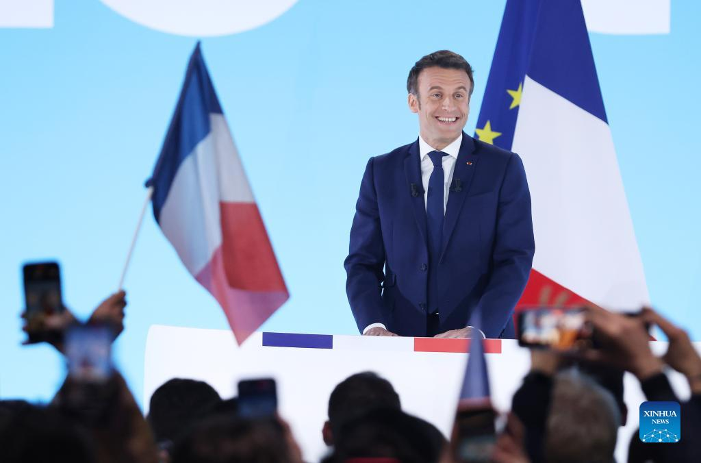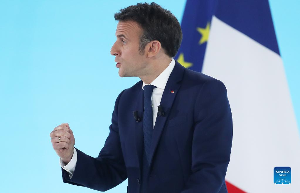 French President Emmanuel Macron delivers a speech at a rally after the first round of French presidential election in Paris, France, on April 10, 2022. French incumbent President Emmanuel Macron and far-right wing candidate Marine Le Pen are the top two leaders of the first round of the 2022 French presidential election with respectively 28.6 percent and 23.7 percent of the votes, according to a preliminary exit poll carried out Sunday by Elabe and released by French television BFMTV. (Xinhua/Gao Jing)