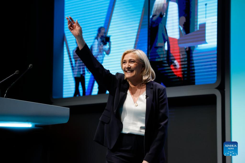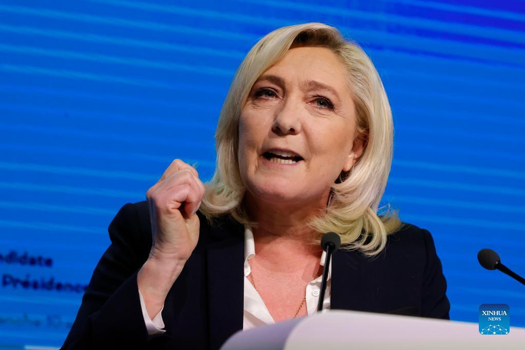 File photo taken on Feb. 5, 2022 shows French far-right National Rally party candidate Marine Le Pen greeting her supporters during a meeting in Reims, France. French incumbent president Emmanuel Macron and far-right wing candidate Marine Le Pen are the top two leaders of the first round of the 2022 French presidential election with respectively 28.5 percent and 24.2 percent of the votes, according to the preliminary exit poll carried out by Elabe and released by French television BFMTV. The two candidates will compete in the presidential run-off scheduled for April 24. (Photo by Rit Heize/Xinhua)