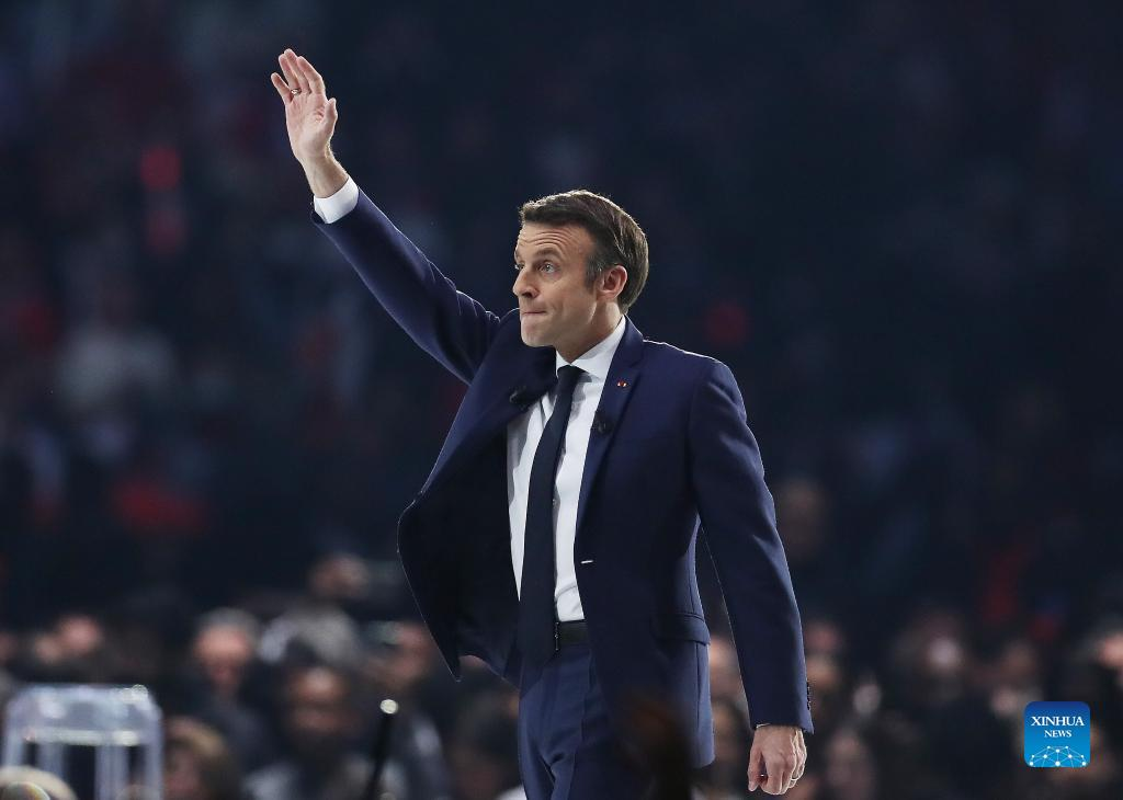 File photo taken on April 2, 2022 shows French President Emmanuel Macron greeting his supporters during his election campaign in Nanterre, on the outskirts of Paris, France. French incumbent president Emmanuel Macron and far-right wing candidate Marine Le Pen are the top two leaders of the first round of the 2022 French presidential election with respectively 28.5 percent and 24.2 percent of the votes, according to the preliminary exit poll carried out by Elabe and released by French television BFMTV. The two candidates will compete in the presidential run-off scheduled for April 24. (Xinhua/Gao Jing)