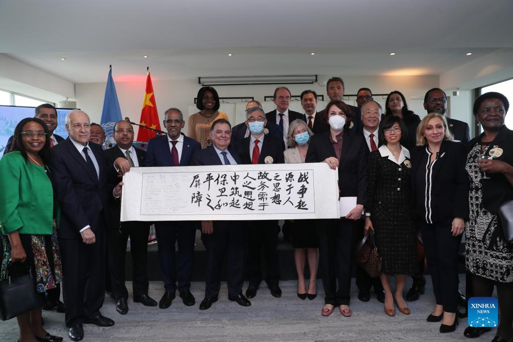 Representatives from permanent delegations to UNESCO write Chinese calligraphy during the events celebrating the 2022 United Nations (UN) Chinese Language Day at the headquarters of UNESCO in Paris, France, April 20, 2022. The UN Chinese Language Day is observed on April 20 every year since 2010, celebrating the language's contribution to the world while encouraging more people to learn it. (Xinhua/Gao Jing)