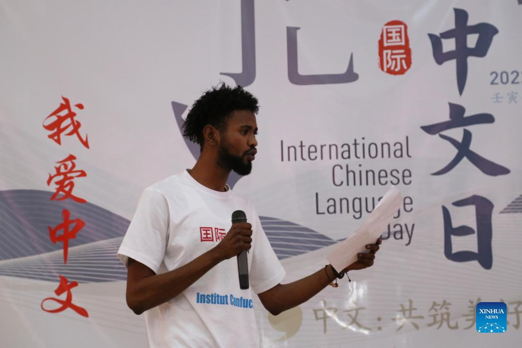(220421) -- DAKAR, April 21, 2022 (Xinhua) -- A Senegalese student reads a poem during an event celebrating the 2022 United Nations (UN) Chinese Language Day at the Confucius Institute of the University of Dakar in Dakar, Senegal, April 20, 2022. The UN Chinese Language Day is observed on April 20 every year since 2010, celebrating the language's contribution to the world while encouraging more people to learn it. (Xinhua/Wang Zizheng)