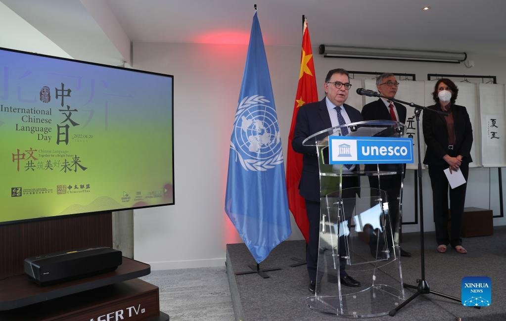 President of the 41st UNESCO General Conference Santiago Mourao (L) addresses the events celebrating the 2022 United Nations (UN) Chinese Language Day at the headquarters of UNESCO in Paris, France, April 20, 2022. The UN Chinese Language Day is observed on April 20 every year since 2010, celebrating the language's contribution to the world while encouraging more people to learn it. (Xinhua/Gao Jing)