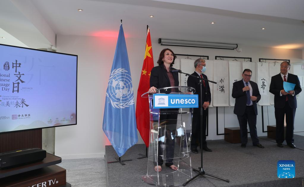 Tamara Siamashvili, chairperson of the Executive Board of UNESCO, addresses the events celebrating the 2022 United Nations (UN) Chinese Language Day at the headquarters of UNESCO in Paris, France, April 20, 2022. The UN Chinese Language Day is observed on April 20 every year since 2010, celebrating the language's contribution to the world while encouraging more people to learn it. (Xinhua/Gao Jing)