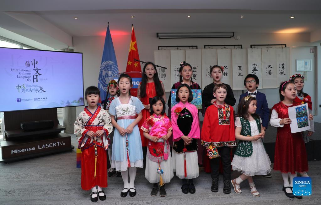 Children sing a Chinese song during the events celebrating the 2022 United Nations (UN) Chinese Language Day at the headquarters of UNESCO in Paris, France, April 20, 2022. The UN Chinese Language Day is observed on April 20 every year since 2010, celebrating the language's contribution to the world while encouraging more people to learn it. (Xinhua/Gao Jing)