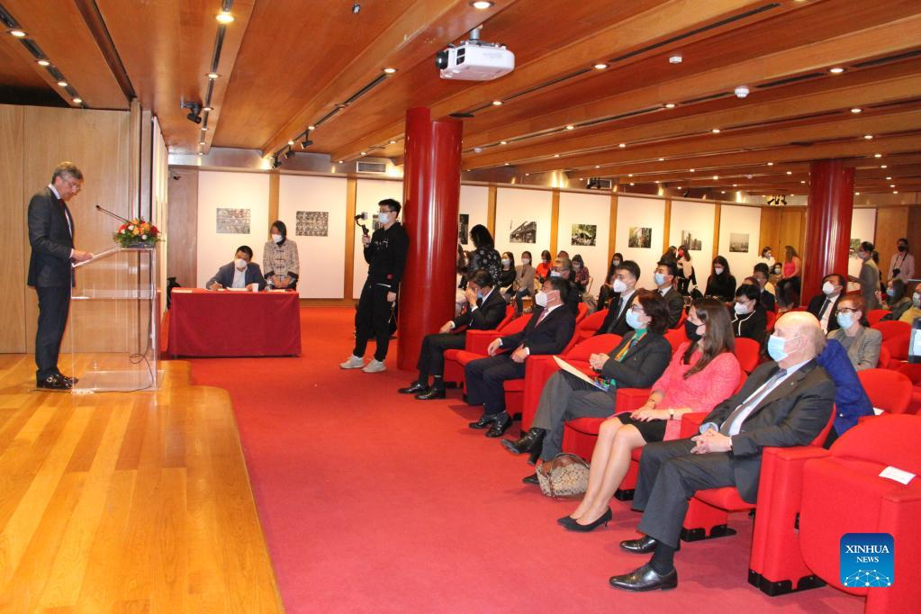 (220421) -- LISBON, April 21, 2022 (Xinhua) -- Photo taken on April 20, 2022 shows an event marking the United Nations (UN) Chinese Language Day in Lisbon, Portugal. The UN Chinese Language Day is observed on April 20 every year since 2010, celebrating the language's contribution to the world while encouraging more people to learn it. (Xinhua/Wen Xinnian)