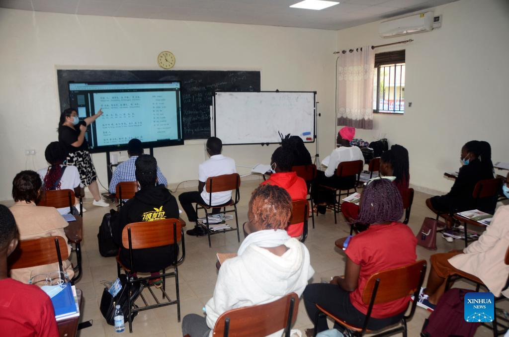 (220421) -- WAKISO, April 21, 2022 (Xinhua) -- A Chinese language instructor teaches a Chinese language class during an event marking the United Nations (UN) Chinese Language Day in Wakiso, Central Region, Uganda, April 20, 2022. The UN Chinese Language Day is observed on April 20 every year since 2010, celebrating the language's contribution to the world while encouraging more people to learn it. (Photo by Nicholas Kajoba/Xinhua)