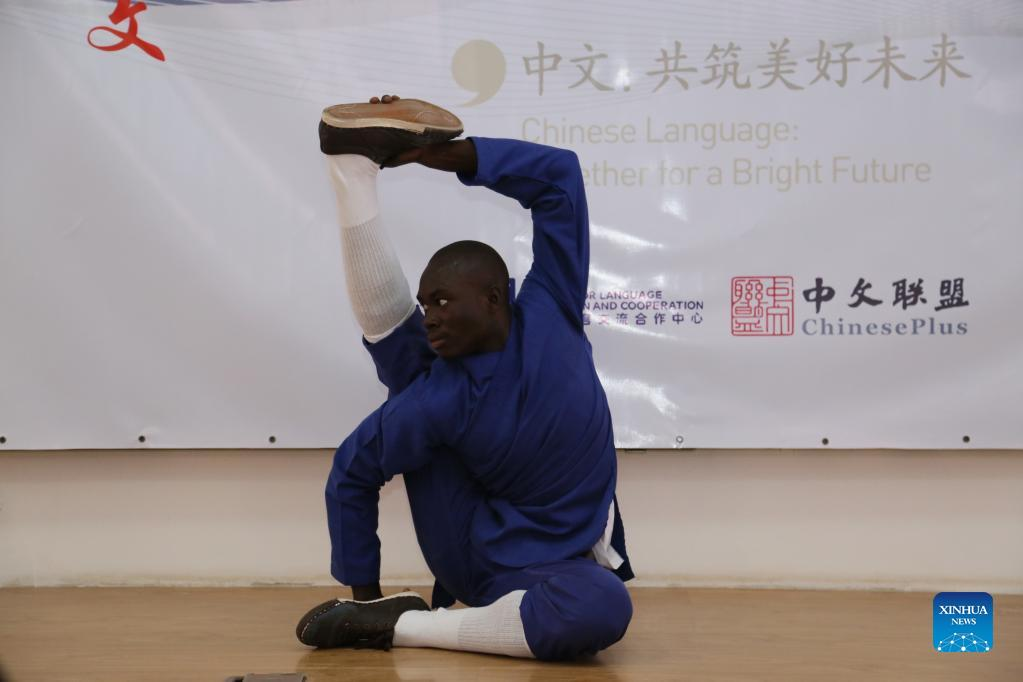 (220421) -- DAKAR, April 21, 2022 (Xinhua) -- A Senegalese student performs Chinese Kungfu during an event celebrating the 2022 United Nations (UN) Chinese Language Day at the Confucius Institute of the University of Dakar in Dakar, Senegal, April 20, 2022. The UN Chinese Language Day is observed on April 20 every year since 2010, celebrating the language's contribution to the world while encouraging more people to learn it. (Xinhua/Wang Zizheng)