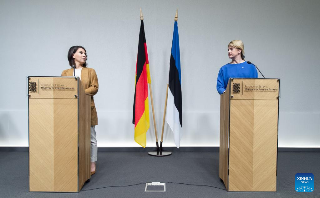 Estonian Foreign Minister Eva-Maria Liimets (R) and her German counterpart Annalena Baerbock attend a joint press conference after their meeting in Tallinn, Estonia, on April 21, 2022. Estonia will increase defense spending over the next four years to 2.5 percent of its gross domestic product (GDP) on average, Estonian Foreign Minister Eva-Maria Liimets said on Thursday. The announcement came during a meeting here with her German counterpart Annalena Baerbock. (Estonian Ministry of Foreign Affairs/Handout via Xinhua)