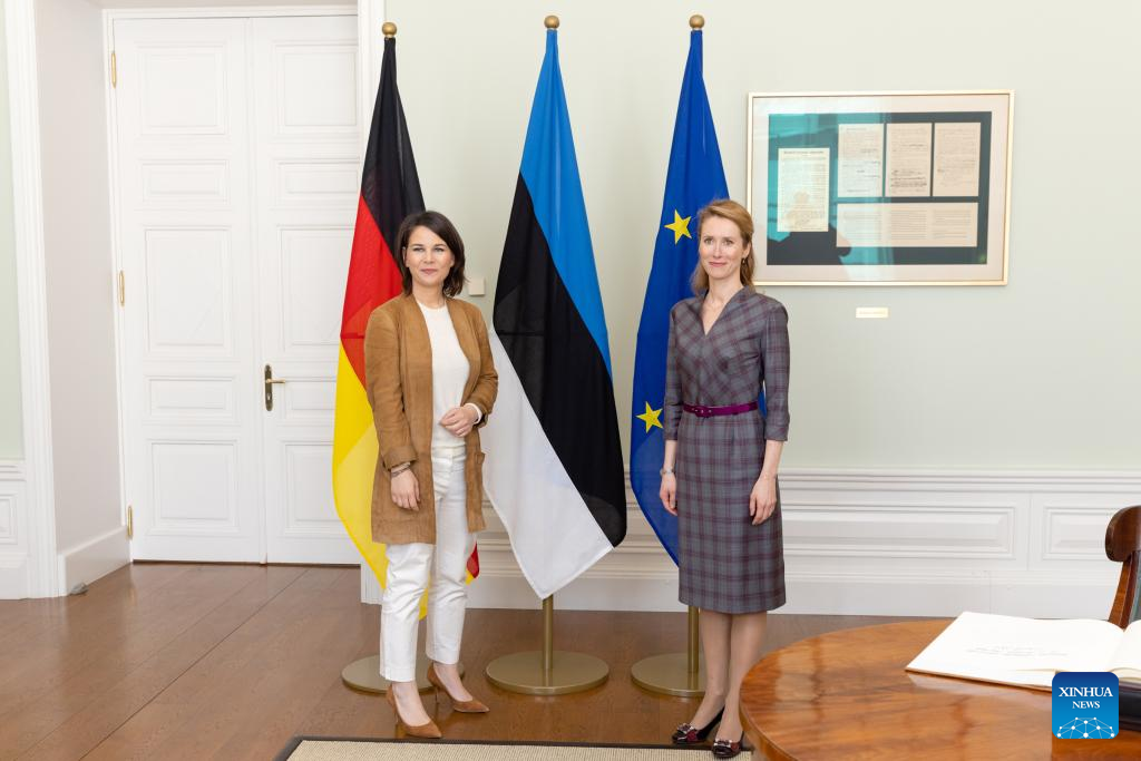 Estonian Prime Minister Kaja Kallas (R) meets with German Foreign Minister Annalena Baerbock in Tallinn, Estonia, on April 21, 2022. (Estonian government/Handout via Xinhua)