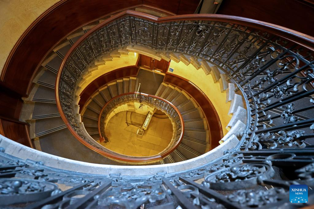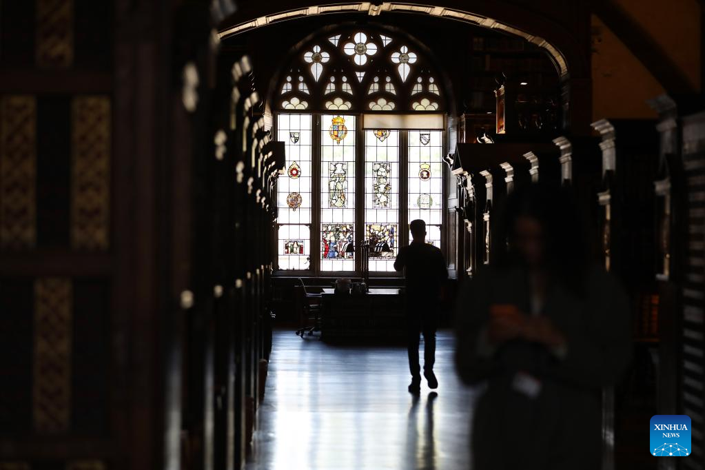 A staff member walks in the Bodleian Libraries in the University of Oxford, Britain, April 21, 2022. As the library service supporting the University of Oxford, Bodleian Libraries include the principal University library, the Bodleian Library, which has been a library of legal deposit for 400 years, as well as 27 other libraries across Oxford including major research libraries and faculty, department and institute libraries.