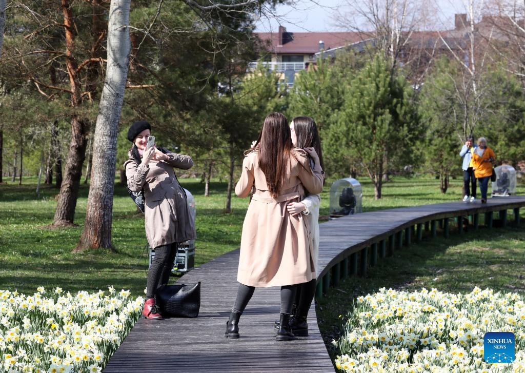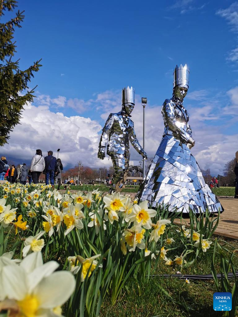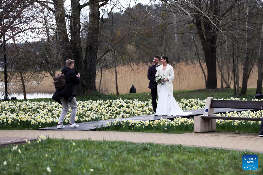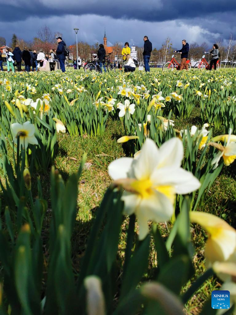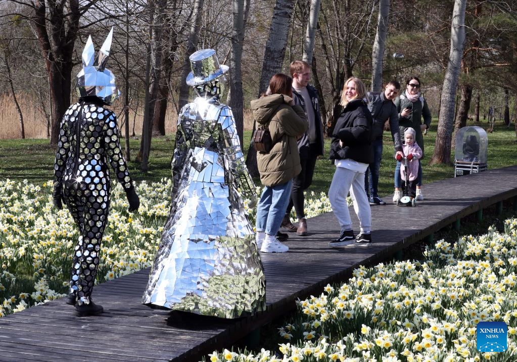 People visit the Festival of Daffodils in Druskininkai, Lithuania, April 23, 2022. From April 22 to 24, the Festival of Daffodils was held in Druskininkai, a spa town located in southern Lithuania. (Xinhua/Xue Dongmei)